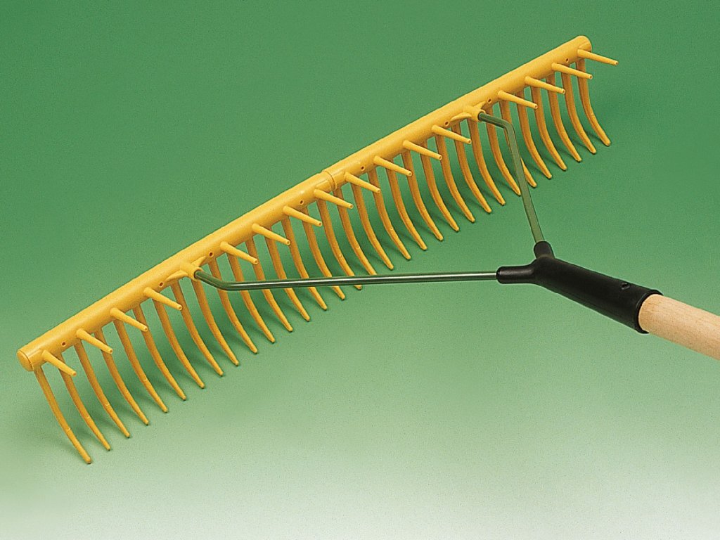 Půjčovna profesionálních hrábí s lehkou násadou pro terénní úpravy a zakládání trávníků.